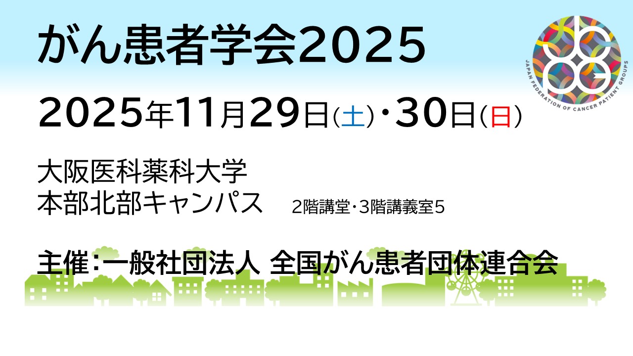 一般社団法人全国がん患者団体連合会(全がん連)では、2024年に国立研究開発法人国立がん研究センターで開催された「がん患者学会2024」に続き、2025年11月29日(土)30日(日)に大阪医科薬科大学にて「がん患者学会2025」を現地開催(一部オンデマンド配信)いたしますので、お知らせいたします。