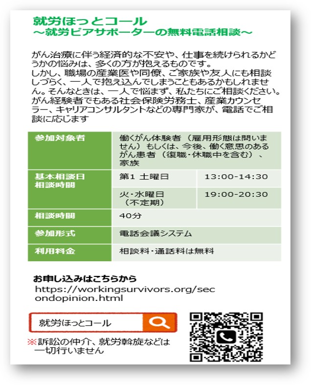 がん治療には、経済的な不安や雇用継続への不安がついてまわります。 職場に産業医がいても相談し難い、友人や同僚、家族にも相談できず、ひとりで悩みを抱え込んでいる方、ご家族の方。1 人で抱え込まないで思い切って第三者の意見を聞いてみませんか?経験豊かな社会保険労務士、産業カウンセラー、キャリアコンサルタント、ソーシャルワーカーなどが電話にて対応いたします。