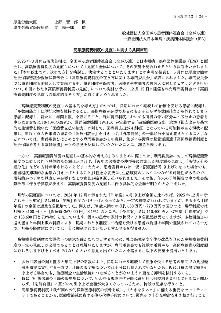 2025年12月24日、高額療養費見直しの具体的な金額が明らかとなったことを受け、全国がん患者団体連合会(全がん連)と日本難病・疾病団体協議会(JPA)は「高額療養費制度の見直しに関する共同声明」を公開、上野賢一郎厚生労働大臣と間隆一郎厚生労働省保険局長に送付提出したことをお知らせします。