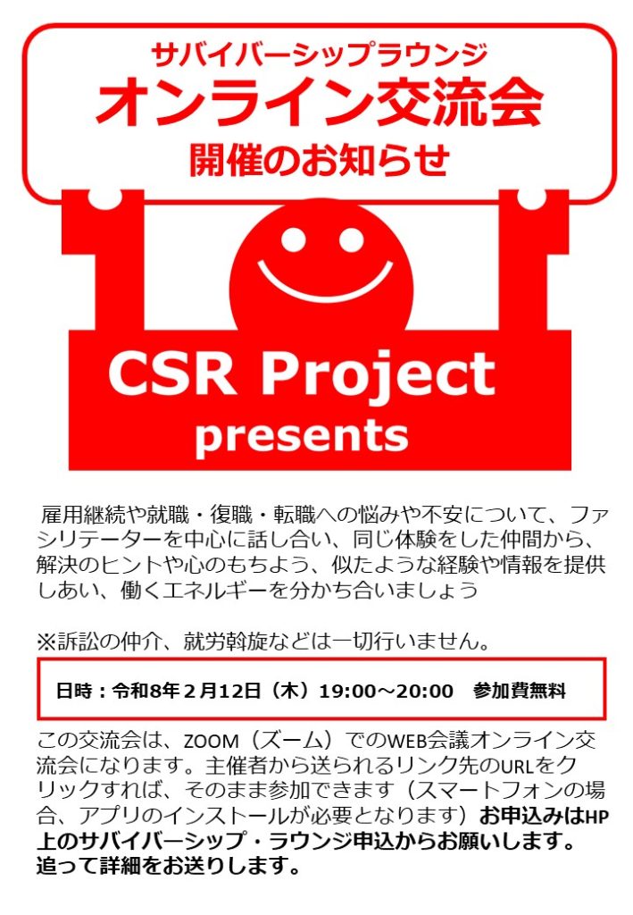 仕事の不安、気持ちが落ち着かない、そんな時、オンラインで仲間と語り合ってみませんか? お申込みはCSRプロジェクトのHPよりお願いいたします。赤色のフォームズです